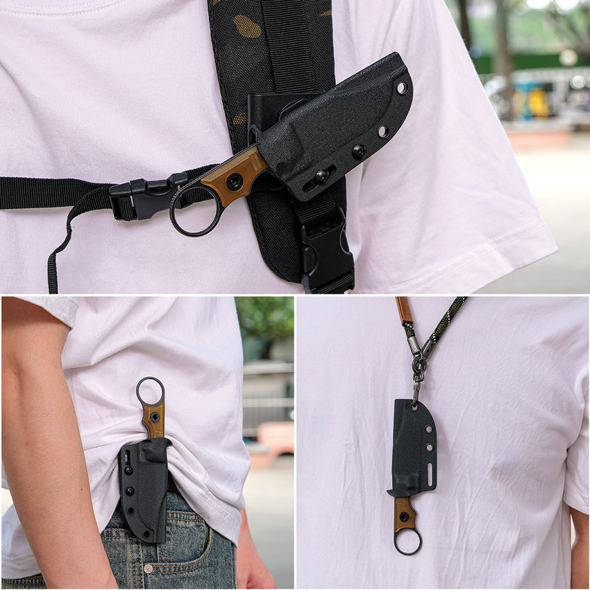 3" (7.62cm) overall. 2.75" (6.99cm) black stonewash finish 14C28N Sandvik stainless bowie blade. Amber PEI handle. Full, extended tang. Finger ring. S. O. A. R. Clip. Black Kydex belt sheath.